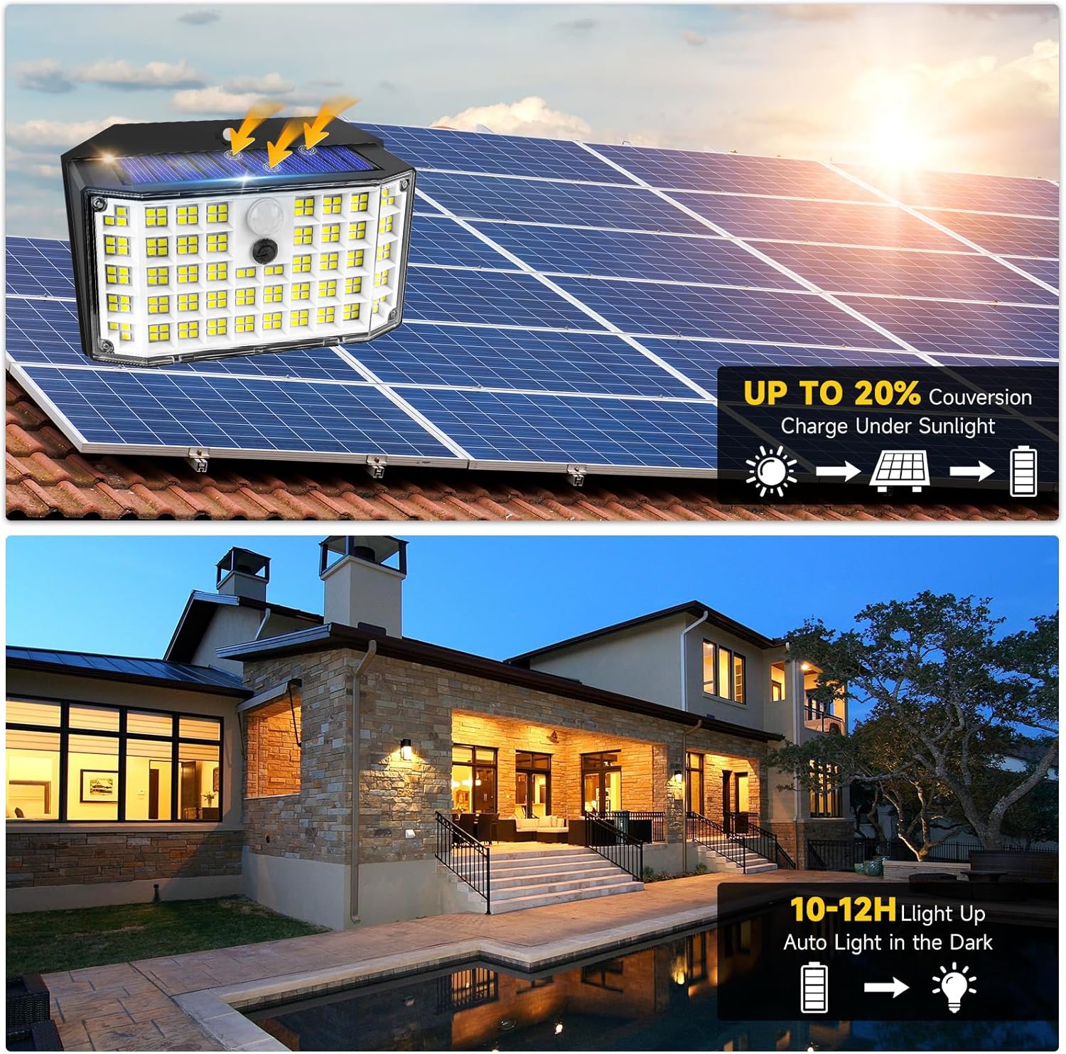 Este pack de cuatro luces solares exteriores está pensado para ofrecer comodidad y seguridad con una eficiencia sobresaliente. Su sistema de tres modos permite adaptar la iluminación a cada situación: luz media constante para un ambiente estable, luz tenue que se convierte en luz alta cuando detecta movimiento, o apagado total con activación en alta al paso de personas o animales. Para maximizar la vida útil del conjunto y ahorrar energía, la recomendación es usar el Modo 3 (apagado + alta con movimiento), con el que la lámpara puede extender su durabilidad aproximadamente un 50 % al reducir encendidos innecesarios y aprovechar mejor cada carga.