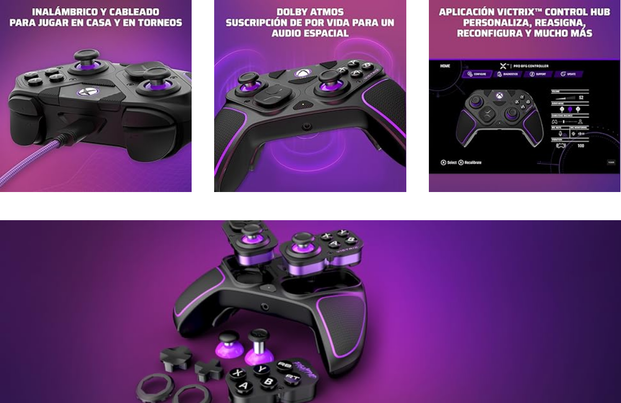La ventaja competitiva no es solo táctil, sino auditiva. El Victrix Pro BFG integra Audio Espacial Dolby Atmos con una suscripción de por vida incluida. Al conectar tus auriculares al puerto de 3,5 mm, accedes a un sonido envolvente que te permite localizar enemigos por sus pasos antes de que aparezcan en pantalla. Mediante el Victrix Control Hub, puedes ajustar perfiles de ecualización para potenciar frecuencias específicas según el juego.