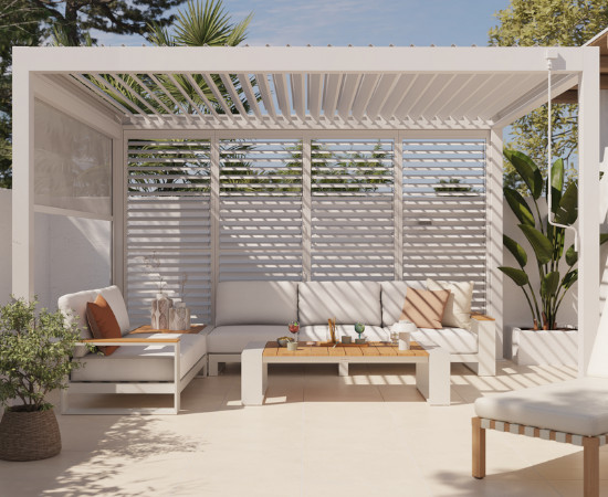 Lo que realmente diferencia a la Naterial Astra es su capacidad para crecer contigo. Se trata de una pérgola modular y escalable. Si buscas más privacidad o protección contra el viento lateral, la estructura está preparada para integrar: