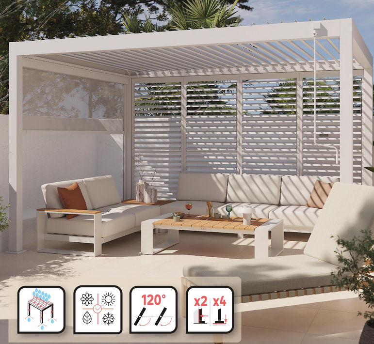 En Invierno: Abre las lamas por completo para invitar a la luz natural a entrar en tu salón (si la tienes adosada) o para calentar el ambiente bajo la estructura. Si empieza a llover, el cierre total crea un techo estanco que dirige el agua hacia un sistema de drenaje integrado oculto en las patas, manteniendo el suelo seco y protegido.