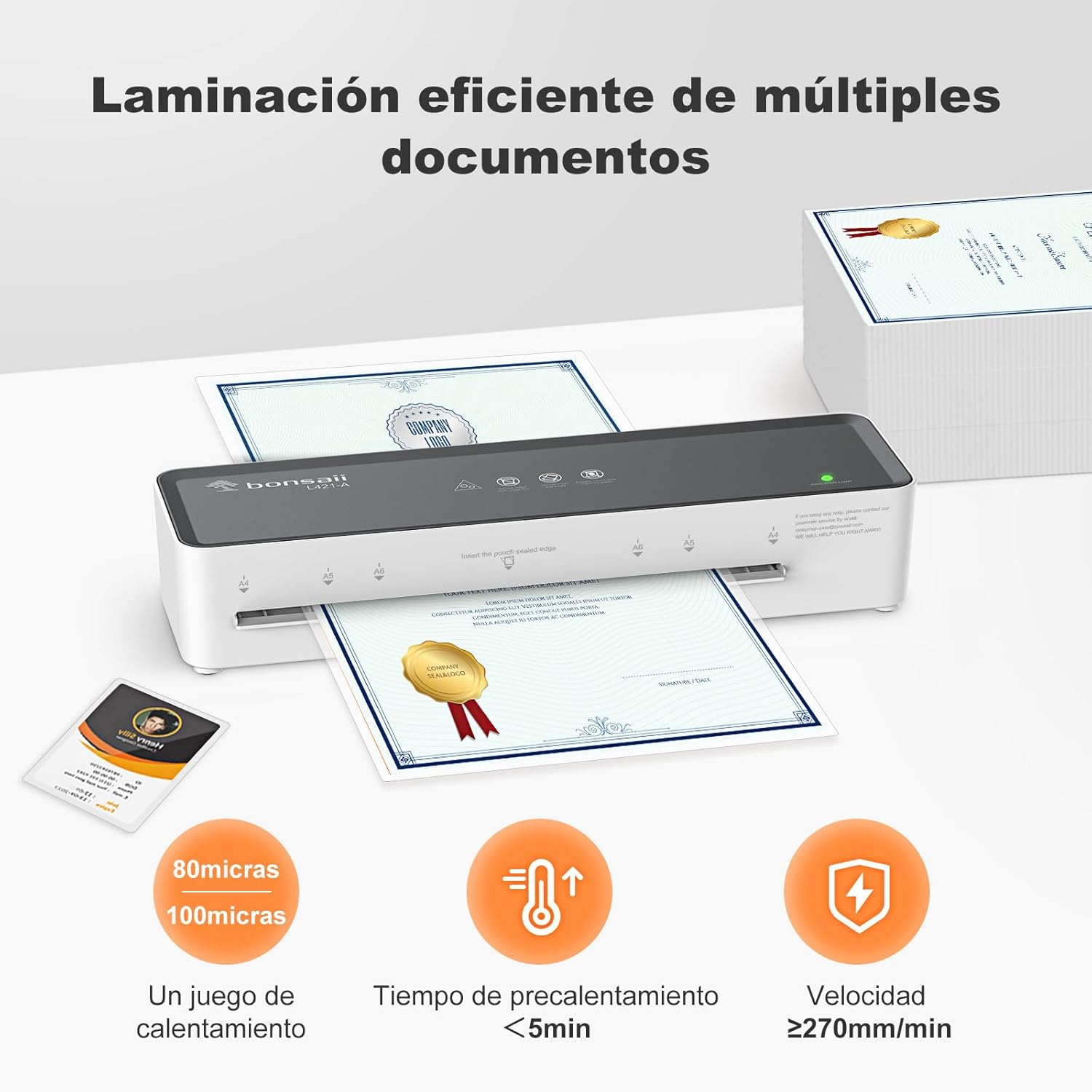 En términos de rendimiento, la Bonsaii L421-A incorpora tecnología NTC, que garantiza una distribución uniforme del calor durante el proceso de laminado. Esto es clave para obtener acabados de calidad profesional, evitando la aparición de burbujas o imperfecciones en los documentos plastificados. Gracias a esta tecnología, el resultado final es limpio, uniforme y resistente.