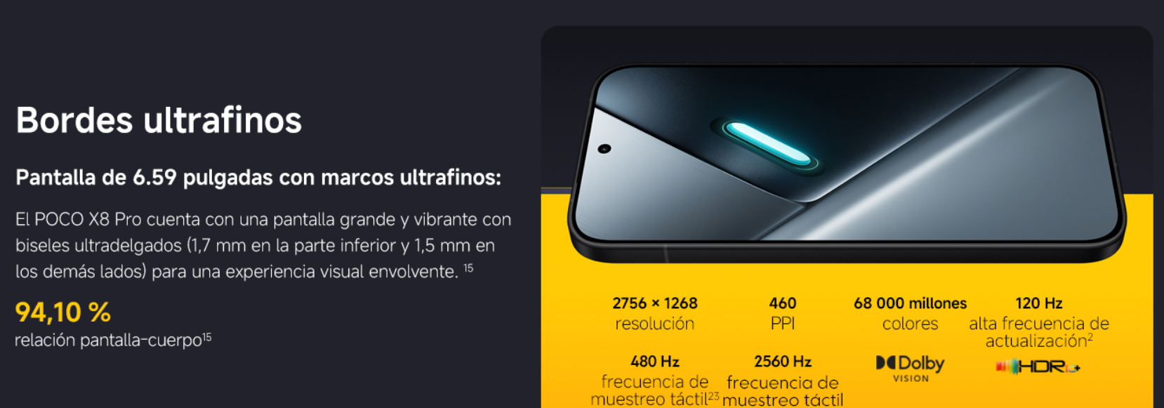 El primer contacto visual con el Poco X8 Pro es, sencillamente, espectacular. Monta un panel AMOLED de 6,59 pulgadas que logra un equilibrio perfecto entre ergonomía y espacio de visualización. Pero lo que realmente lo diferencia es su resolución de 2.756 x 1.268 píxeles, ofreciendo una nitidez superior a la media de su segmento. Para los entusiastas del contenido multimedia y el gaming, los 120 Hz de refresco garantizan una fluidez absoluta. Además, Poco ha puesto especial énfasis en la salud ocular y la visibilidad en exteriores: