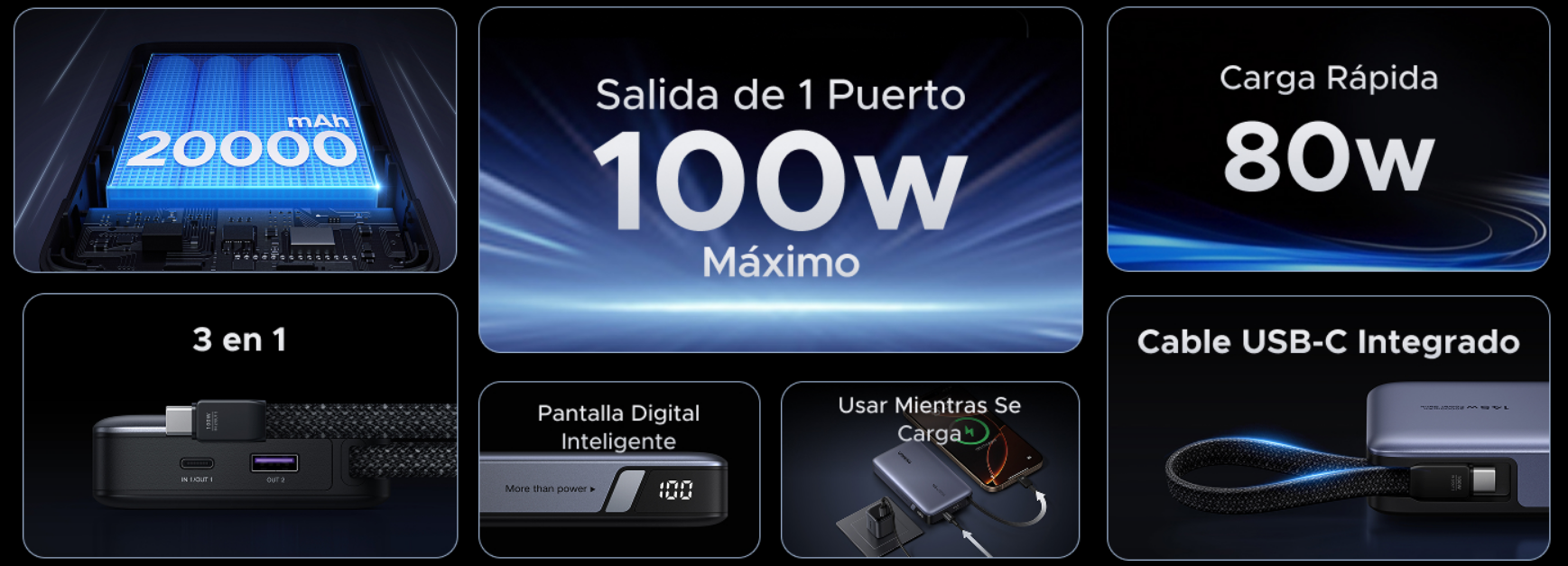 La UGREEN Nexode es una batería externa pensada para quienes necesitan carga fiable, rápida y portátil durante viajes, jornadas largas de trabajo o cuando la toma de corriente queda lejos. Con 20000 mAh de capacidad y un diseño que combina un cable integrado con múltiples puertos, ofrece una solución completa para mantener activos teléfono, tableta y portátil sin complicaciones.