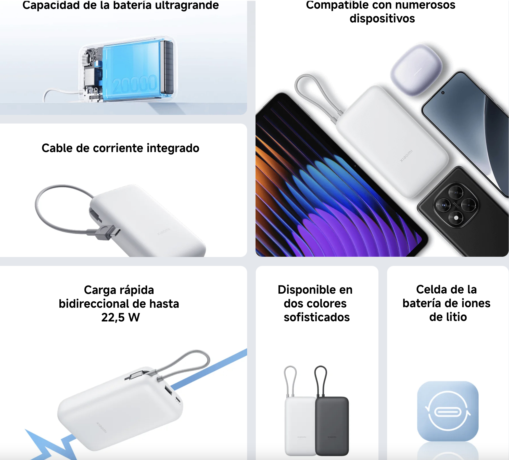 La Xiaomi BHR9738GL es una batería externa diseñada para quienes necesitan energía constante y fiable en cualquier entorno. Con una capacidad de 20000 mAh y un diseño cuidado en color blanco, este powerbank está pensado especialmente para técnicos, creadores de contenido, estudiantes e informáticos que trabajan fuera de la oficina y no pueden permitirse interrupciones. Su propuesta combina alta capacidad, versatilidad de conexiones y un formato compacto que facilita el transporte diario.