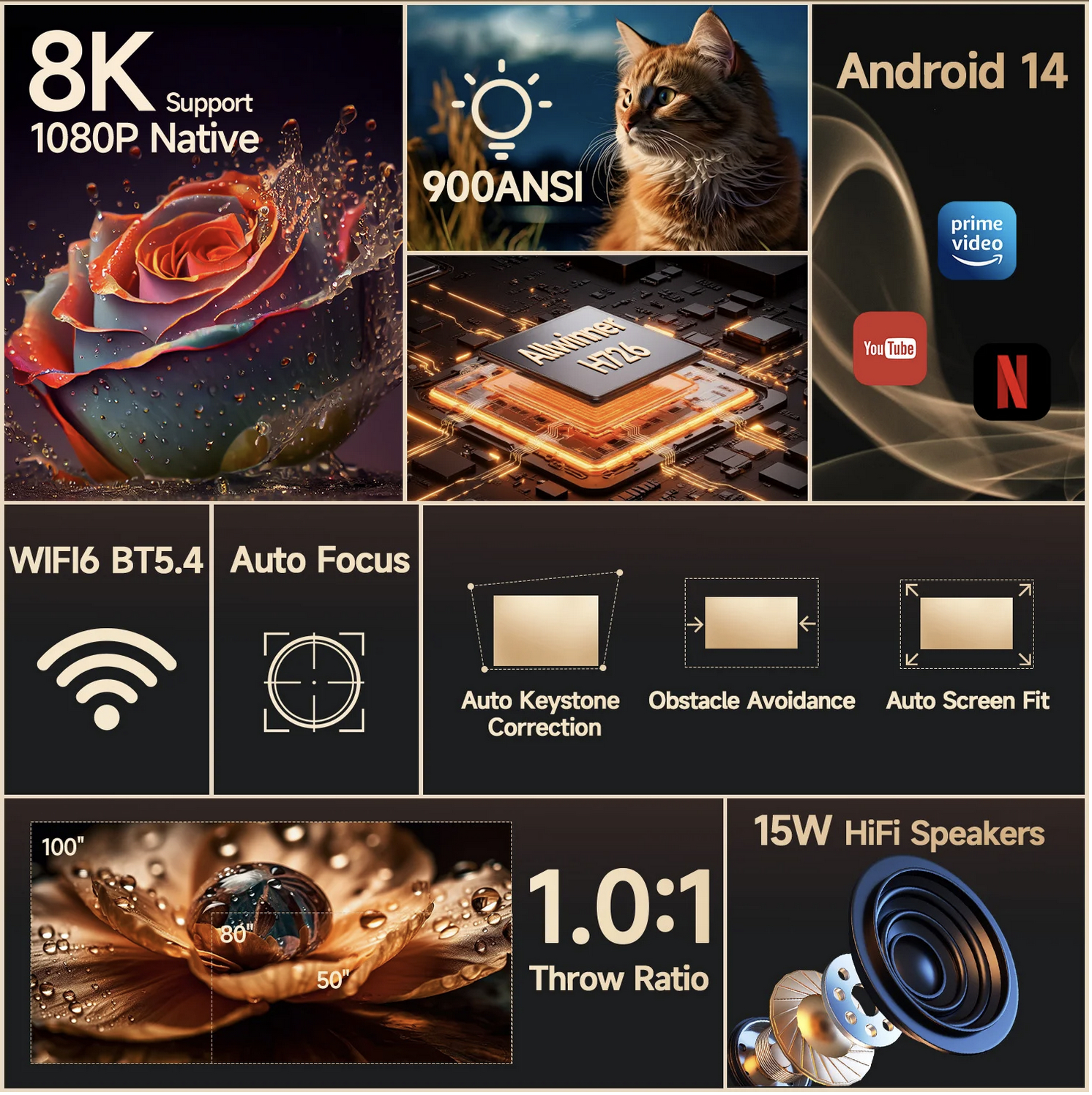 La resolución nativa es 1080P Full HD real, lo que garantiza una imagen definida, con buen nivel de detalle y nitidez en películas, series, eventos deportivos y videojuegos. Aunque admite reproducción de contenido en 4K e incluso 8K, es importante comprender que la proyección final se muestra en resolución 1080P, ya que esa es su resolución física nativa. Sin embargo, la compatibilidad con formatos de alta resolución amplía considerablemente las opciones de reproducción y asegura una mayor versatilidad con distintos tipos de archivos y plataformas de streaming. El resultado visual es una imagen inmersiva, con colores equilibrados y una claridad que resulta más que suficiente para la mayoría de usuarios que buscan una experiencia cinematográfica doméstica.