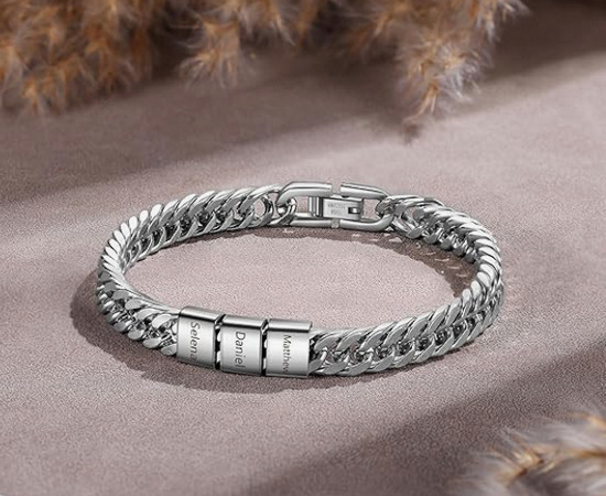 Más allá de su impecable confección, esta pulsera destaca por su capacidad de convertirse en un símbolo personal. Su diseño de eslabones tipo cubano, atemporal y masculino, se realza con la posibilidad de incorporar entre uno y seis nombres grabados en pequeñas cuentas metálicas. Estos grabados no solo aportan un toque distintivo, sino que transforman la joya en una pieza única, cargada de valor sentimental. Las joyas personalizadas tienen un poder especial: no solo adornan, sino que cuentan historias. Esta pulsera es ideal para celebrar vínculos profundos, ya sea el amor de pareja, la fuerza de la paternidad, la complicidad entre hermanos o la admiración hacia un amigo o colega. Por eso, se convierte en un regalo perfecto para fechas significativas como el Día del Padre, un cumpleaños, un aniversario, Navidad, San Valentín o cualquier ocasión en la que se quiera expresar afecto de forma auténtica y duradera. También es una excelente elección como obsequio para uno mismo, como recordatorio de logros personales o de personas importantes en la vida.