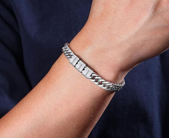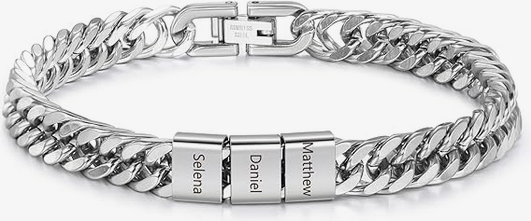 Esta pulsera personalizada para hombre con nombres grabados es un claro ejemplo de cómo un complemento puede transformarse en un testimonio de afecto y unión familiar. Diseñada para llevar en la muñeca un recuerdo constante de los seres queridos, esta pulsera combina estilo, resistencia y un valor emocional único.