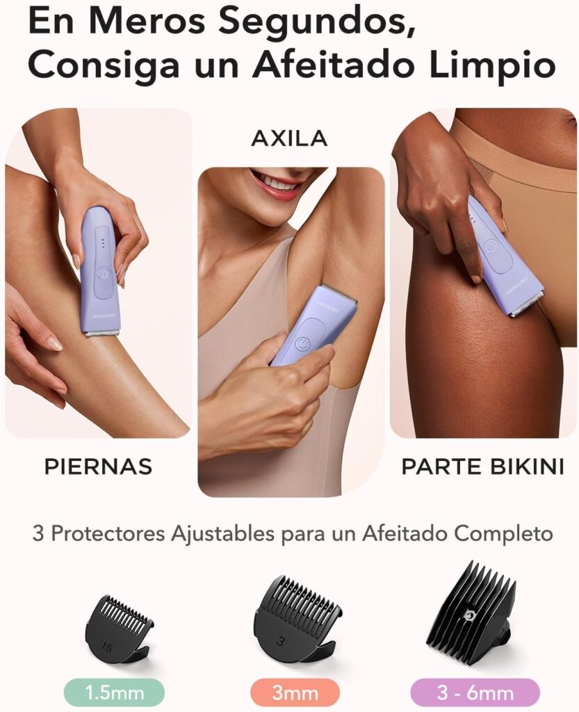 La impermeabilidad es otro de sus grandes atributos. Poder utilizar la rasuradora en la ducha no solo facilita el proceso, sino que también mejora la higiene, ya que el agua ayuda a enjuagar los recortes de manera inmediata. Esta característica convierte a la LadySpot en una opción versátil y segura, capaz de resistir salpicaduras y adaptarse a diferentes rutinas de cuidado corporal. Además, su diseño está pensado para trabajar en distintas zonas del cuerpo, incluyendo espalda, pecho y pubis, ofreciendo una solución integral para quienes buscan practicidad y comodidad en un solo dispositivo.La personalización es clave en el cuidado personal, y la LadySpot lo entiende perfectamente. Por eso incluye cuatro peines-guía ajustables (1,5 mm, 3 mm, 3-6 mm y 9-12 mm), que permiten elegir entre diferentes estilos y longitudes de corte. Esta variedad de opciones asegura que cada usuaria pueda adaptar la rasuradora a sus preferencias, ya sea para un afeitado completo, un recorte más sutil o un estilo intermedio que combine comodidad y estética.