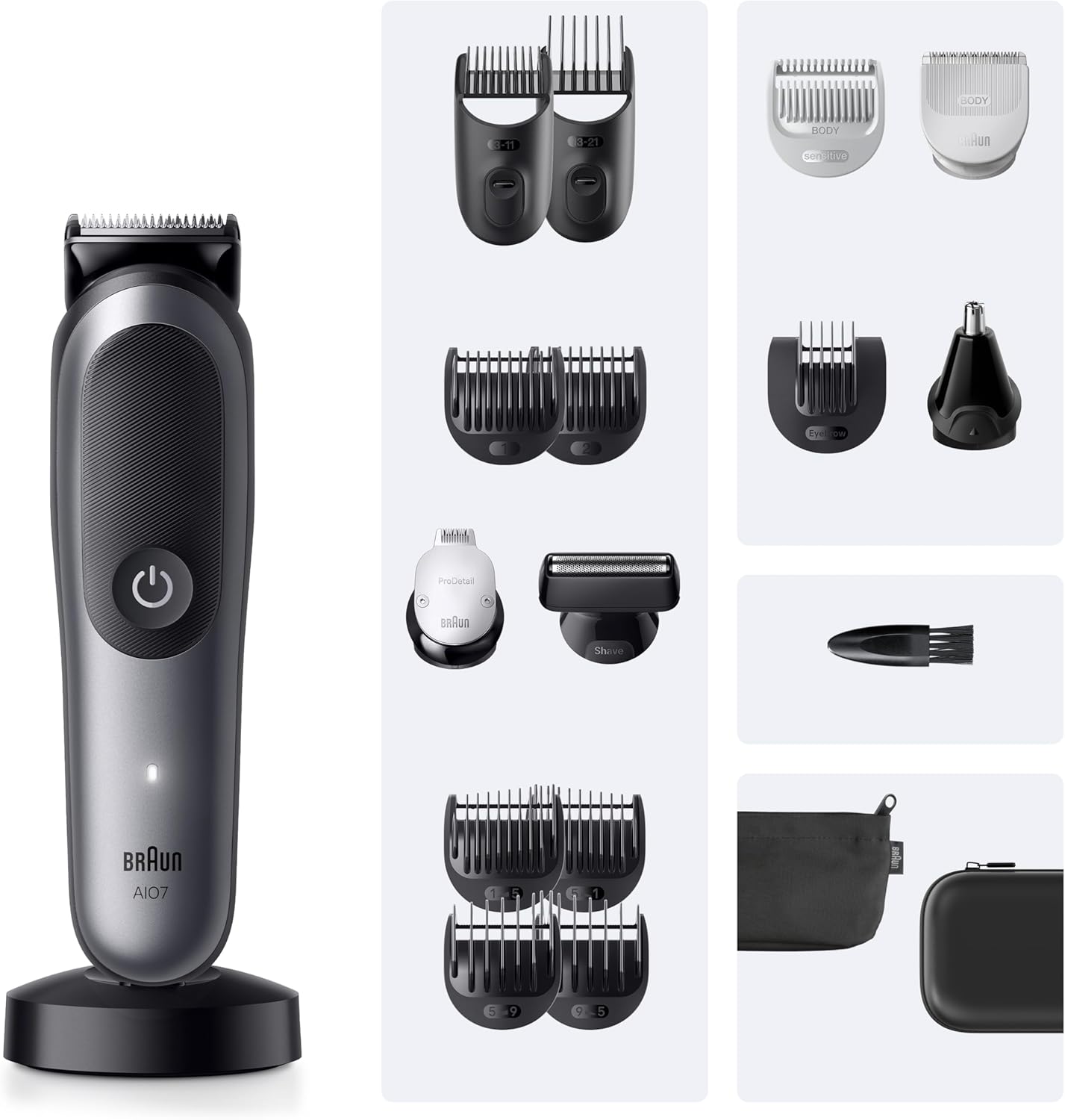 La recortadora Todo en Uno Braun Series 7 AIO7585 es un dispositivo multifuncional diseñado para quienes buscan eficiencia, versatilidad y un cuidado personal completo con un solo aparato. Este modelo forma parte de la gama “all-in-one” de Braun, pensada para cubrir no solo el recorte de barba, sino también el corte de cabello, el mantenimiento del vello corporal y el cuidado de zonas específicas como nariz, orejas e incluso cejas. Una de sus principales virtudes es que permite sustituir varios dispositivos individuales, lo que facilita una rutina de aseo más organizada y práctica.