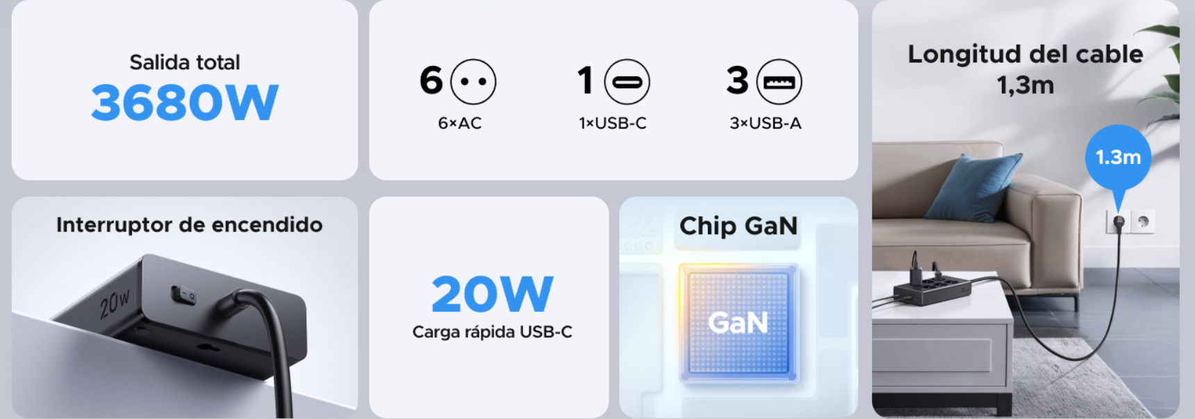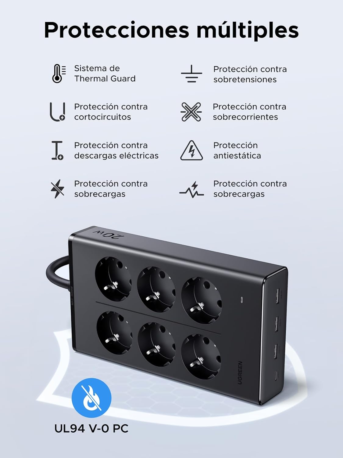 La gestión de múltiples dispositivos electrónicos en casa o en la oficina puede convertirse en un desafío si no se cuenta con una solución práctica y segura. Estaegleta 10 en 1 de Ugreen ha sido diseñada para responder a esa necesidad, ofreciendo una combinación única de potencia, versatilidad y protección avanzada. Con seis enchufes de corriente alterna, tres puertos USB-A y un puerto USB-C de carga rápida, este accesorio se convierte en el centro de energía ideal para quienes buscan comodidad y eficiencia en su día a día.
