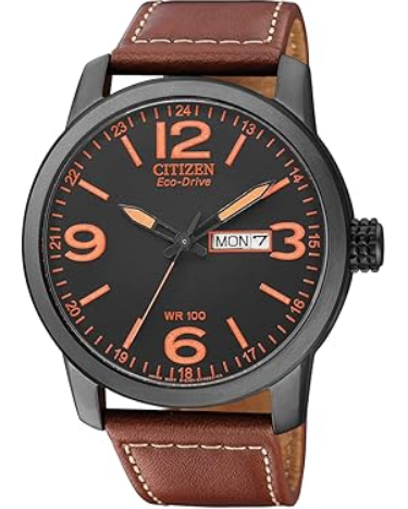 La esfera negra está protagonizada por grandes números arábigos en naranja en las posiciones principales y marcadores igualmente naranja para facilitar la lectura rápida. Las agujas, también en naranja con relleno luminiscente, garantizan visibilidad en condiciones de baja iluminación. A las tres en punto aparece una ventana de día y fecha, dispuesta de forma clara y funcional. El bisel y la caja muestran líneas sobrias y masculinas, mientras que la corona texturada permite un manejo cómodo y preciso. El cristal es mineral, resistente a impactos cotidianos y pensado para un uso continuado sin perder claridad. La caja y los acabados interiores están pensados para equilibrar durabilidad y confort. Con una resistencia al agua de WR 10 bar, equivalente a 100 metros, el reloj soporta baños, natación y actividades acuáticas recreativas sin comprometer su funcionamiento. La correa de piel en tono marrón con costura blanca equilibra el carácter técnico del reloj con una sensación de acabado premium. Su anchura y la elección del color la hacen versátil para combinar con ropa casual y también con looks más cuidados. El sistema de cierre facilita la colocación y asegura un ajuste firme durante la jornada.