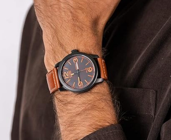 La esfera negra está protagonizada por grandes números arábigos en naranja en las posiciones principales y marcadores igualmente naranja para facilitar la lectura rápida. Las agujas, también en naranja con relleno luminiscente, garantizan visibilidad en condiciones de baja iluminación. A las tres en punto aparece una ventana de día y fecha, dispuesta de forma clara y funcional. El bisel y la caja muestran líneas sobrias y masculinas, mientras que la corona texturada permite un manejo cómodo y preciso. El cristal es mineral, resistente a impactos cotidianos y pensado para un uso continuado sin perder claridad. La caja y los acabados interiores están pensados para equilibrar durabilidad y confort. Con una resistencia al agua de WR 10 bar, equivalente a 100 metros, el reloj soporta baños, natación y actividades acuáticas recreativas sin comprometer su funcionamiento. La correa de piel en tono marrón con costura blanca equilibra el carácter técnico del reloj con una sensación de acabado premium. Su anchura y la elección del color la hacen versátil para combinar con ropa casual y también con looks más cuidados. El sistema de cierre facilita la colocación y asegura un ajuste firme durante la jornada.