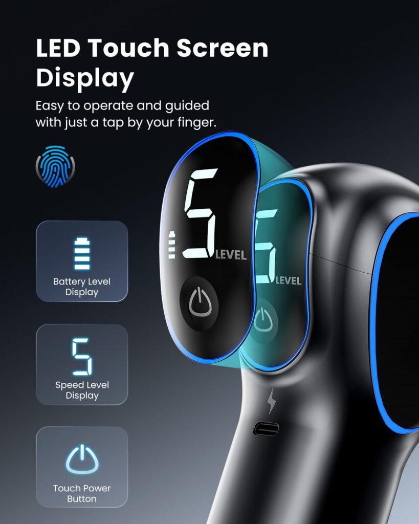 La experiencia de usuario se eleva gracias a su pantalla táctil LED, desde donde puedes monitorizar en tiempo real el nivel de batería y la velocidad seleccionada. Para adaptarse a cada grupo muscular y nivel de sensibilidad, el dispositivo incluye: