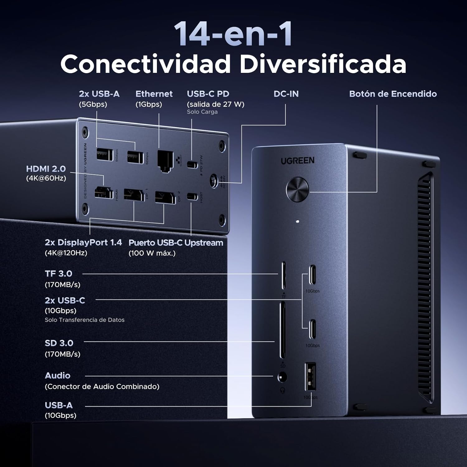 Alimentación Externa: Conecta siempre el adaptador de corriente de 140W incluido a la entrada DC IN para garantizar que todos los puertos reciban la energía necesaria.