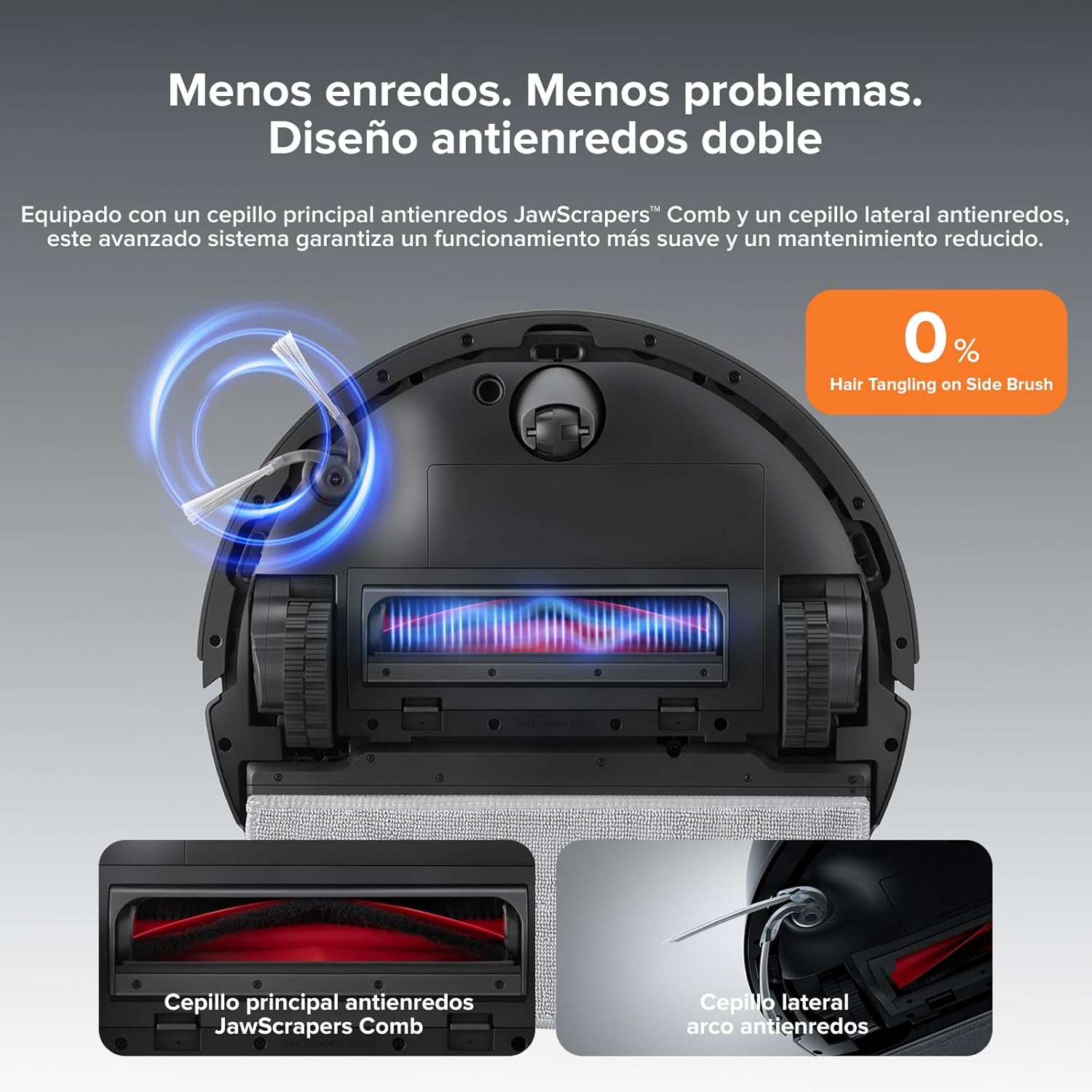 En cuanto a la fregona, el robot cuenta con una mopa de gran tamaño con sistema Auto-Lifting. Esta tecnología detecta automáticamente las alfombras y eleva la mopa para evitar mojarlas, permitiendo una transición fluida entre aspirado y fregado. Además, facilita el desplazamiento sobre umbrales y pequeños obstáculos de hasta 2 cm, garantizando una limpieza ininterrumpida y sin esfuerzo en todo el hogar.