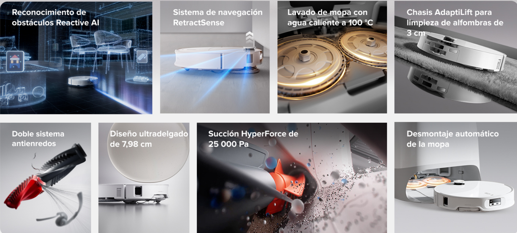 Con un perfil de apenas 7,98 cm de altura, este modelo soluciona el eterno problema de los sensores láser (LDS) que chocan con la base del sofá. Su tecnología RetractSense permite retraer el sistema de navegación láser para deslizarse bajo muebles bajos. En espacios abiertos, el LDS se eleva para un escaneo de 360°, pero en zonas estrechas mantiene una visión trasera de 100°, garantizando que ningún rincón quede sin mapear.