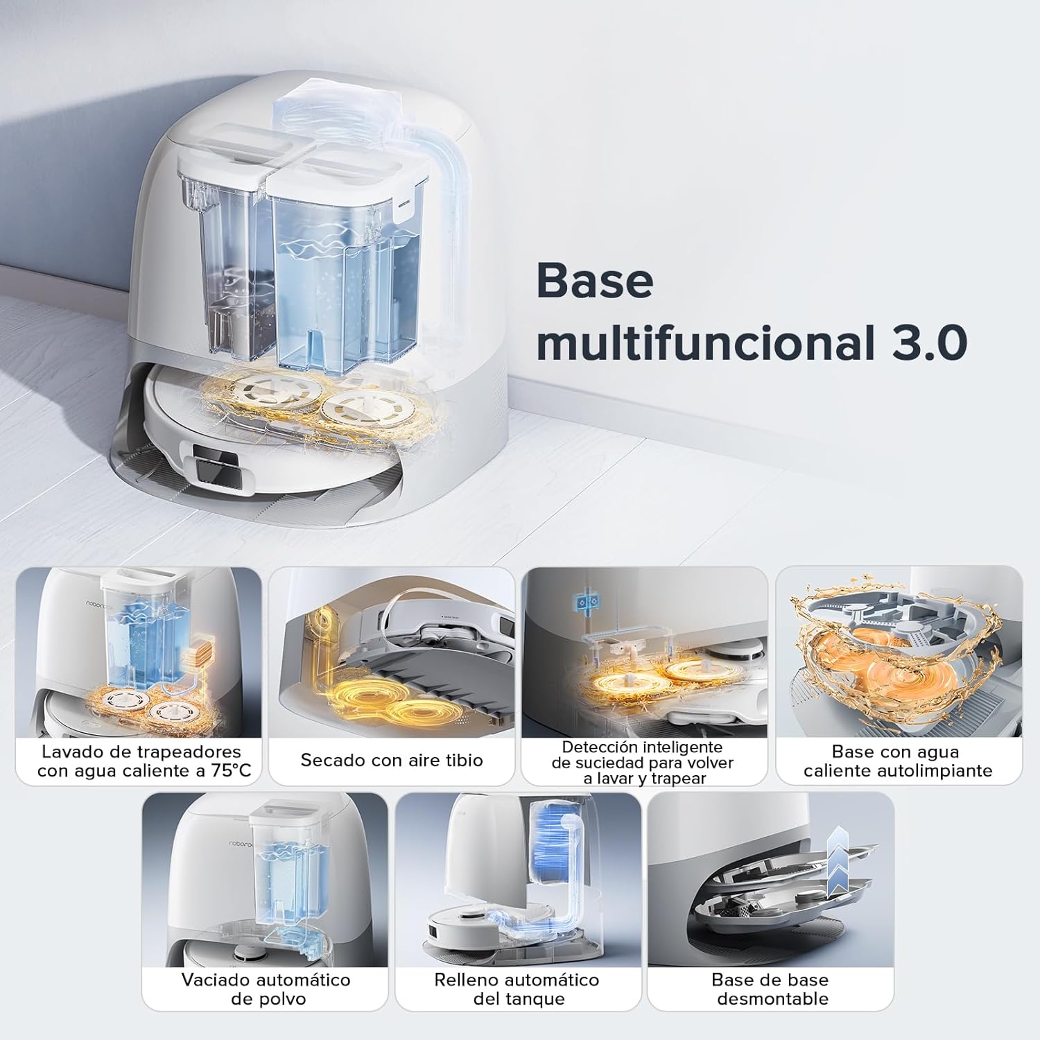 La potencia de succión es otro de los pilares de este modelo. Con 18.500 Pa de HyperForce, líder en el sector, el Roborock Qrevo Curv se posiciona como uno de los robots más potentes disponibles. Esta fuerza, combinada con el cepillo DuoDivide, permite capturar incluso las partículas más pequeñas, como el polvo incrustado en las rendijas de los suelos duros o la suciedad atrapada en alfombras y moquetas. La capacidad de enfrentarse a escenarios exigentes lo convierte en un aliado indispensable para quienes buscan resultados profesionales en la limpieza doméstica.