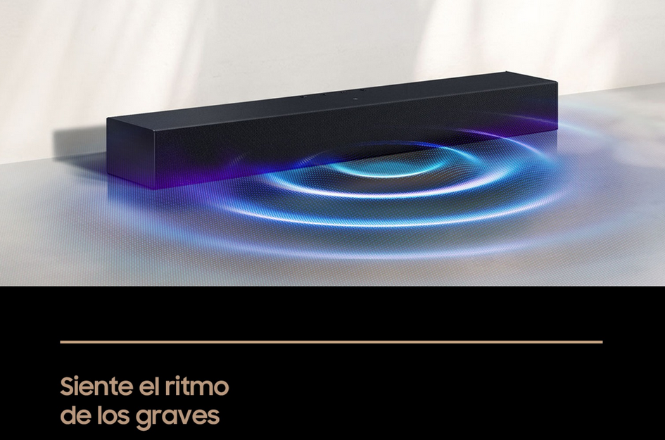 Uno de los grandes atractivos de la Samsung HW-B400F/ZF es su diseño compacto y estilizado, que se adapta a cualquier espacio sin restar protagonismo a la decoración. Puede colocarse directamente bajo el televisor o montarse en la pared, lo que la convierte en una solución flexible para salones de todos los tamaños. Su acabado elegante encaja perfectamente en ambientes modernos y minimalistas, aportando un toque de sofisticación tecnológica.