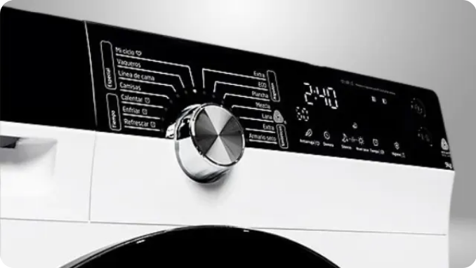 La experiencia de uso ha sido simplificada mediante una pantalla LED clara y mandos giratorios intuitivos. Desde el panel electrónico, puedes configurar el inicio diferido de hasta 24 horas, permitiéndote organizar las tareas del hogar según tus horarios o aprovechar las tarifas eléctricas más económicas de la madrugada. El diseño también aborda problemas comunes de usabilidad: