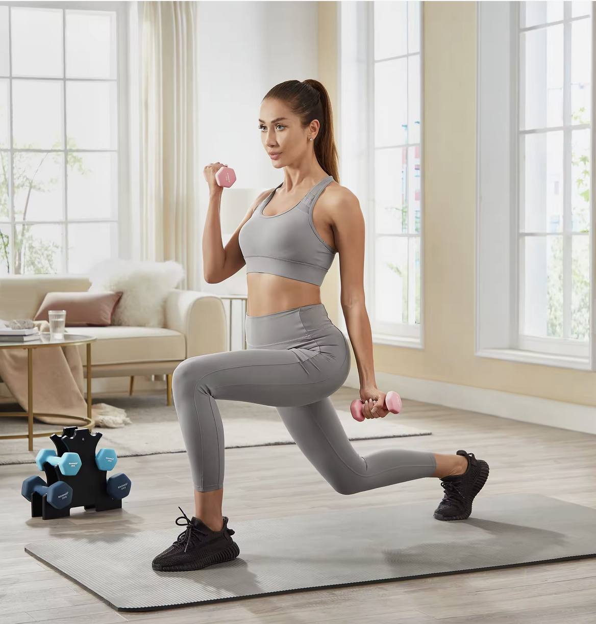 El set de mancuernas está compuesto por un soporte donde van situadas las seis mancuernas, 2 en color rosa de 1 kg de peso cada una, 2 mancuernas en color azul celeste de 2 kg de peso cada una, y otras dos en color azul oscuro de 3 kg cada una. Son aptas para todas las edades y niveles de entrenamiento, sin importar la condición física en que se encuentre el usuario.