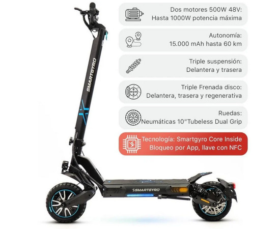 Para los más exigentes, este patinete ofrece libertad, potencia y protección al mismo tiempo. Cada detalle, desde el tacto firme del manillar hasta la respuesta del acelerador, se ha calibrado para elevar la experiencia de la movilidad eléctrica. Descubre un nuevo horizonte en tus desplazamientos diarios y aventuras off-road: el Smartgyro Dual Max 2 LR te está esperando.