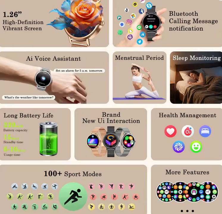 Para las amantes del deporte, el reloj incorpora más de 100 modos deportivos, incluyendo caminar, correr, ciclismo interior y exterior, yoga, fitness, natación, baloncesto, fútbol, montañismo, baile, máquina de remo y muchos más. Cada actividad registra datos clave que ayudan a medir el rendimiento y progresar en los entrenamientos.