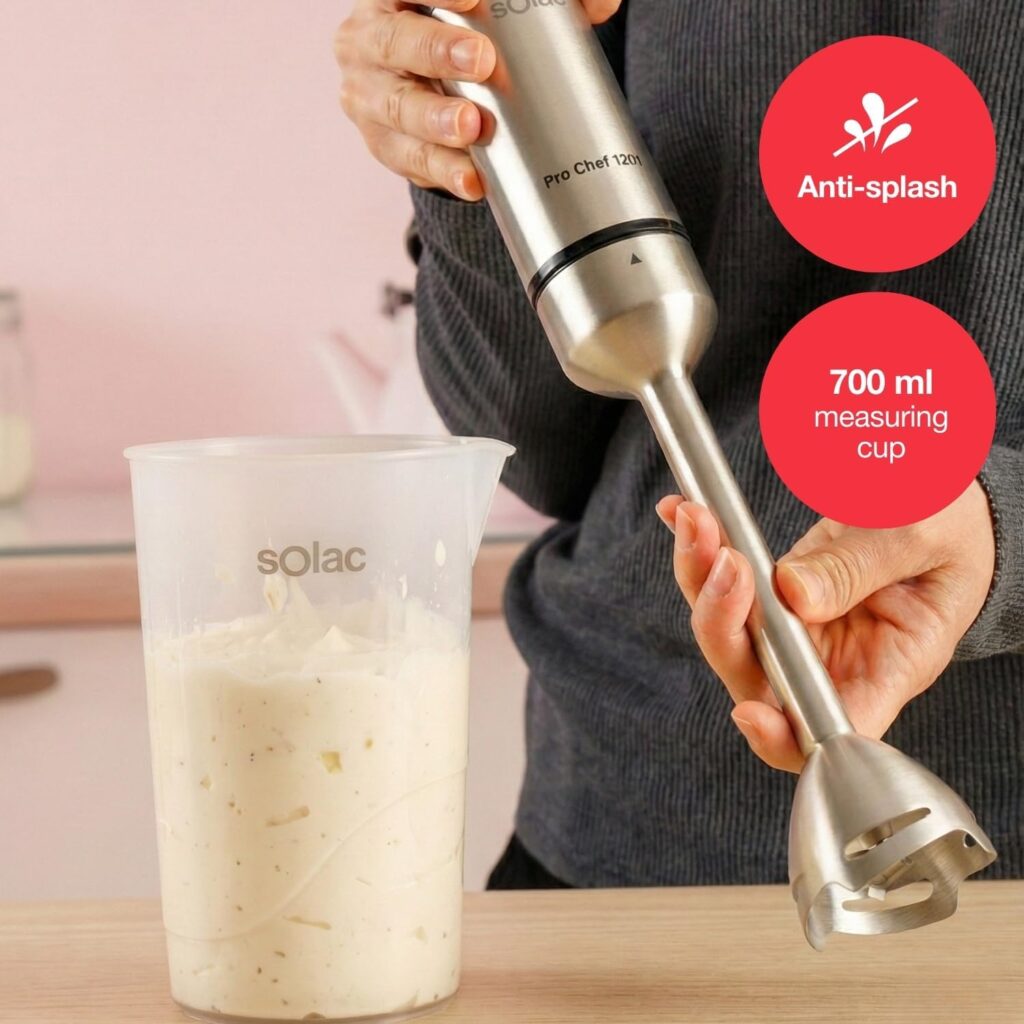 La construcción de la Solac Pro Chef refleja un compromiso con la calidad profesional. Tanto el cuerpo como la varilla están fabricados en acero inoxidable, un material que no solo garantiza una larga vida útil y resistencia a la corrosión, sino que permite algo fundamental en la cocina moderna: la capacidad de trabajar directamente con alimentos calientes dentro de la olla. Esto elimina la necesidad de trasvasar líquidos hirviendo, reduciendo riesgos y ahorrando tiempo.