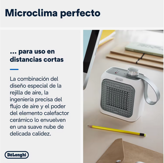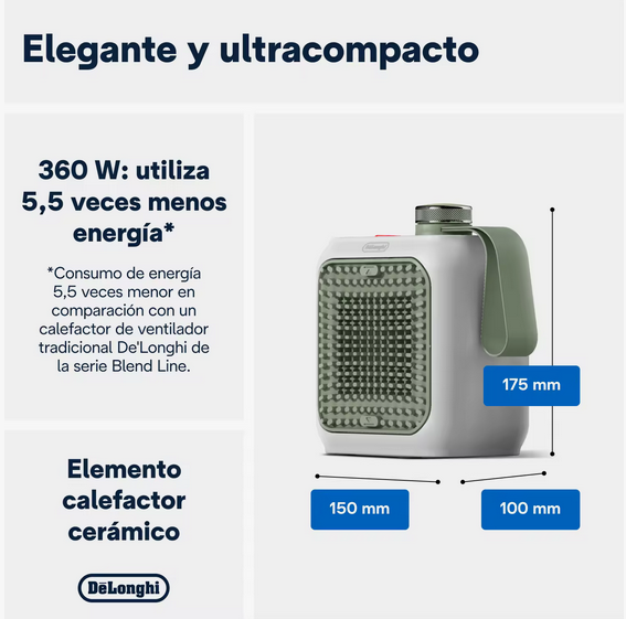 Este calefactor cerámico personal no intenta calentar una habitación entera, sino transformar tu microclima inmediato —ya sea en tu oficina, rincón de lectura o mesita de noche— en un refugio de confort absoluto. A diferencia de los radiadores convencionales que consumen miles de vatios, el De’Longhi Capsule Desk HFX10B03 opera con una potencia máxima de 350W. Esta configuración «micro» está diseñada estratégicamente para ofrecer la energía justa para calentar tus manos y cuerpo de forma directa. Es la herramienta ideal para combatir el frío estacional mientras trabajas, permitiéndote mantener una temperatura agradable de manera sostenible y económica.