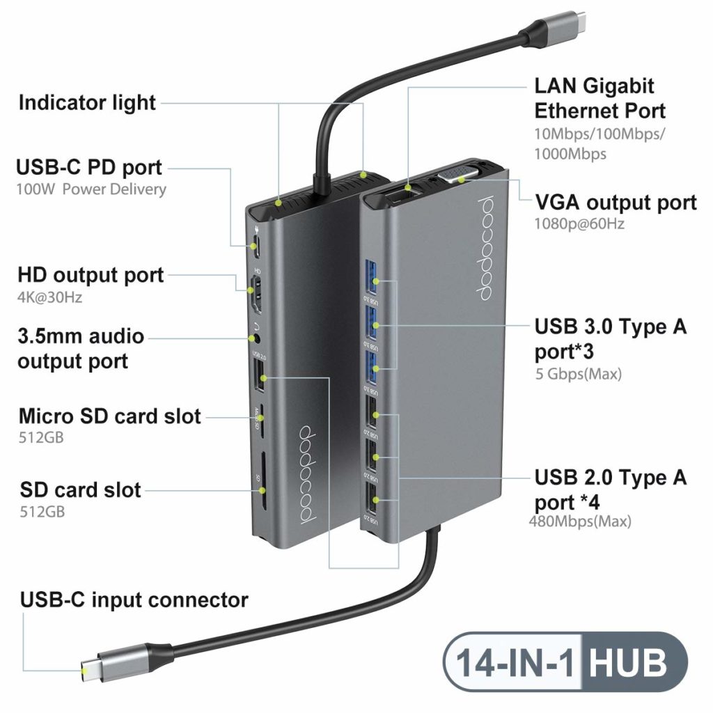 Los hubs son esos periféricos destinados a ampliar las posibilidades de conectividad de nuestro equipo, normalmente un portátil, aunque por supuesto, también de sobremesa) que en un principio, podemos llegar a pensar que no nos van a hacer falta. Pero con el paso del tiempo nos damos cuenta que inevitablemente tenemos que conectar todo tipo de aparatos a nuestro ordenador por más puertos USB y claro, los portátiles actuales son tan finos que ya no caben dichos puertos tipo A. Luego puede que tu equipo no tenga lector de tarjetas y ale, ya necesitamos otro aparato. Muchas veces nos viene bien poner a cargar nuestro smartphone mientras trabajamos aprovechando que tenemos el equipo encendido pero nuestro nuevo móvil tiene conexión tipo C. También es posible que tengamos en mente conectar una segunda pantalla y no nos vendría mal una salida HDMI 4K o tal vez tengas algún proyector etc que tiene algunos años pero funciona bien y requiere de conexión VGA. Todos nos conectamos por wifi a la red, pero hay veces que nos puede fallar la señal inalámbrica y necesitamos echar mano del cable y ¡ops! nuestro portátil ya no tiene el puerto RJ45. Vaya, al final resulta que el hub en cuestión tienen que estar bien completito, pero resulta que hay en el mercado hubs que ofrecen todas estas funcionalidades.Hoy traemos uno de ellos, nos ofrece todo lo descrito anteriormente y por tan solo 33,99€ sobre su precio en Amazon de 43,99€ aplicando el código descuento QSGICZGB. Fabricado en aluminio para facilitar la dispersión del calor aunque lo tengas trabajando a tope, el hub de dodocool es un 14 en 1 amplimente compatible con un gran número de equipos y dispositivos.