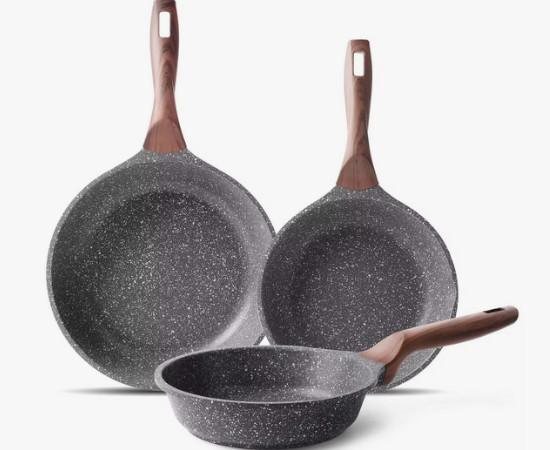 Cocinar también tiene un componente visual y emocional. El diseño de este juego de sartenes combina un elegante acabado de recubrimiento de granito con mangos ergonómicos de imitación madera. El objetivo es recuperar la calidez del estilo tradicional y rústico sin renunciar a las ventajas de la tecnología moderna.