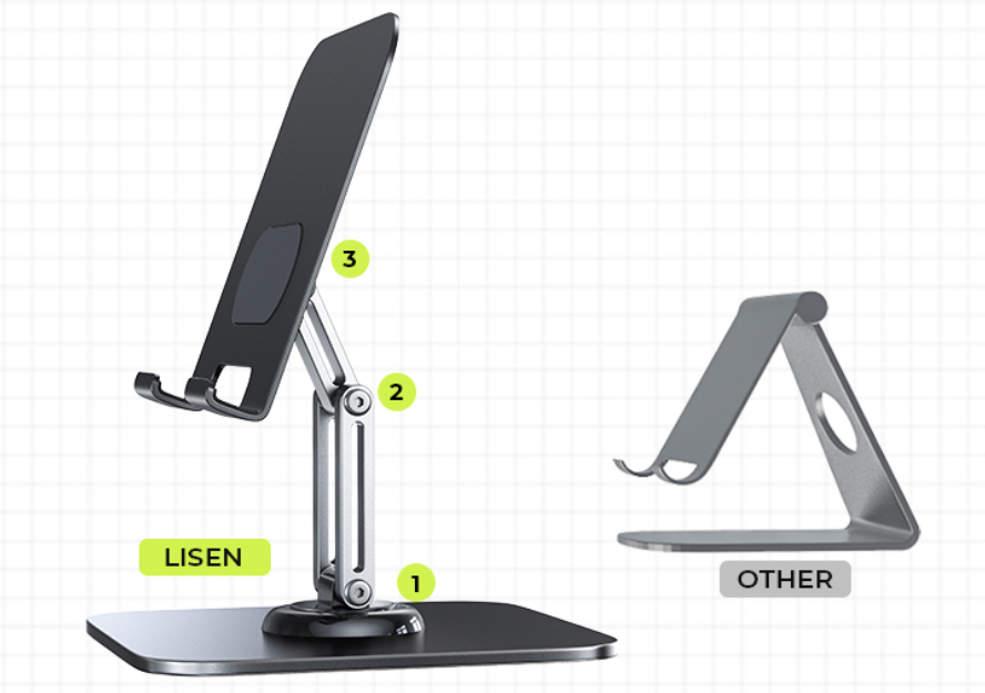 A diferencia de los soportes convencionales, Lisen apuesta por una estructura totalmente metálica con una base más pesada y ancha que garantiza una estabilidad inigualable. Para proteger las superficies de su escritorio, cuenta con una almohadilla de silicona antideslizante de gran extensión, evitando rayas y desplazamientos accidentales. Además, cada pieza posee un acabado láser que asegura bordes suaves y seguros al tacto. Este soporte ha sido testado rigurosamente, confirmando su compatibilidad universal con dispositivos de 4.7″ a 13″, incluyendo modelos de Samsung, Xiaomi, Lenovo, iPad Air y teléfonos móviles.