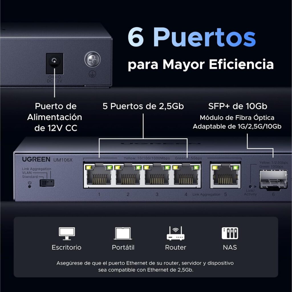 Este dispositivo cuenta con una configuración de puertos híbrida. Ofrece 5 puertos RJ45 de 2,5 G que cumplen con los estándares IEEE 802.3/u/x/ab/bz. Estos puertos son «inteligentes», ya que se adaptan automáticamente a velocidades de , , o según el dispositivo conectado. Pero la verdadera potencia reside en su puerto SFP+ de 10 G. Este puerto es ideal para conectar un servidor NAS, una estación de trabajo de edición de video o un enlace troncal a otro switch, soportando velocidades de hasta bajo los estándares IEEE 802.3z/ae. A diferencia de los switches «tontos» de bajo coste, Ugreen permite personalizar el comportamiento de la red con tres modos de funcionamiento físicos: