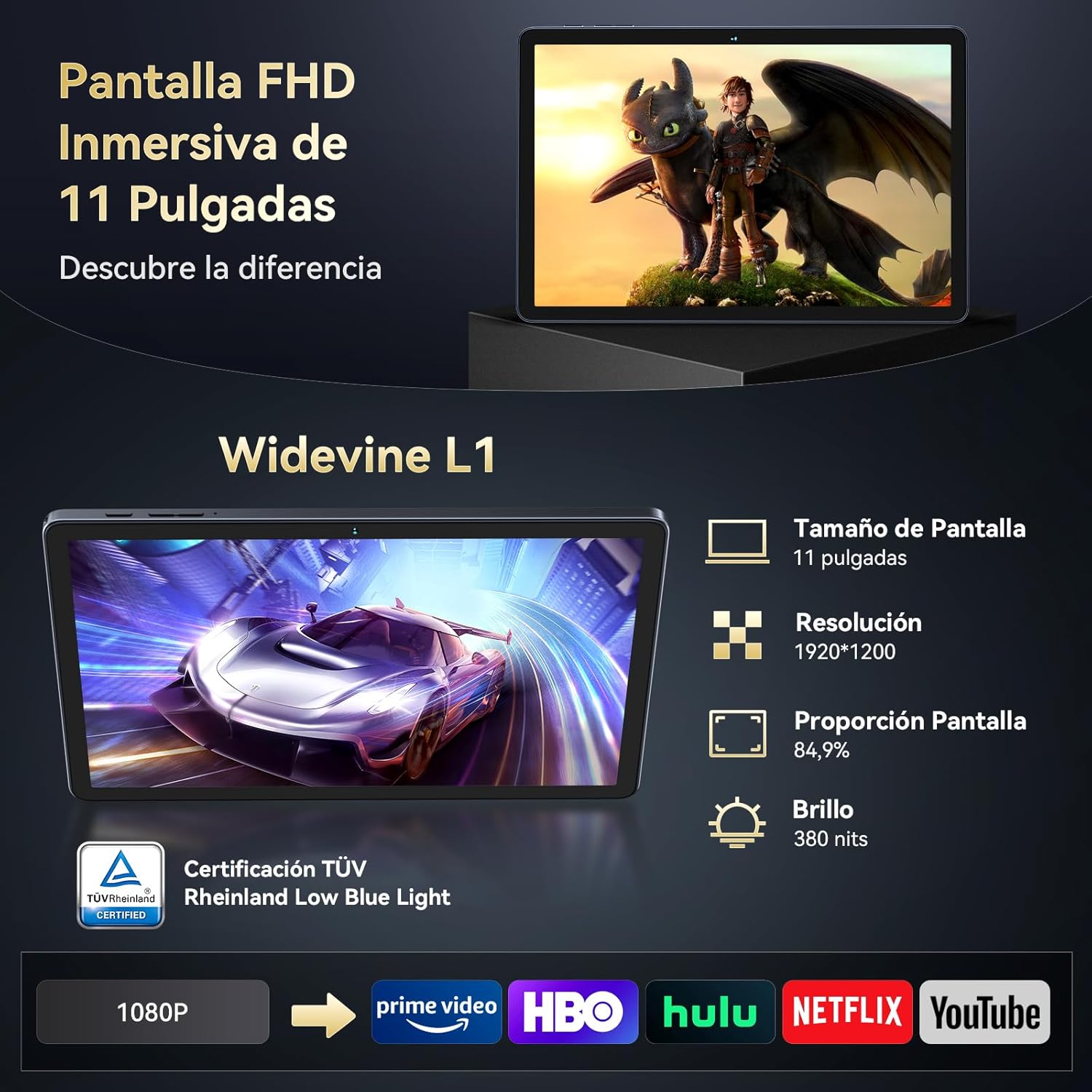 11″ FHD+ con Certificación TÜV (Anti luz azul)