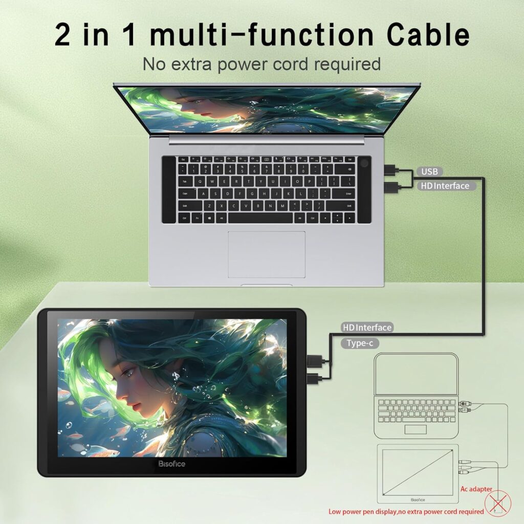 La Bisofice 12HD-A ofrece una pantalla IPS laminada completa de 11,6 pulgadas que potencia la experiencia creativa con una superficie activa de 258 x 145 mm y resolución 1366 x 768. Los colores se muestran con profundidad gracias a 16,7 millones de tonos, contraste 1000:1, brillo de 250 cd/m² y un ángulo de visión de 178°, proporcionando una imagen amplia, clara y fiel al detalle. La construcción laminada elimina el espacio entre trazo y cursor, reduciendo la desviación visual y mejorando la precisión del control, lo que resulta en una sensación de dibujo más natural y exacta.