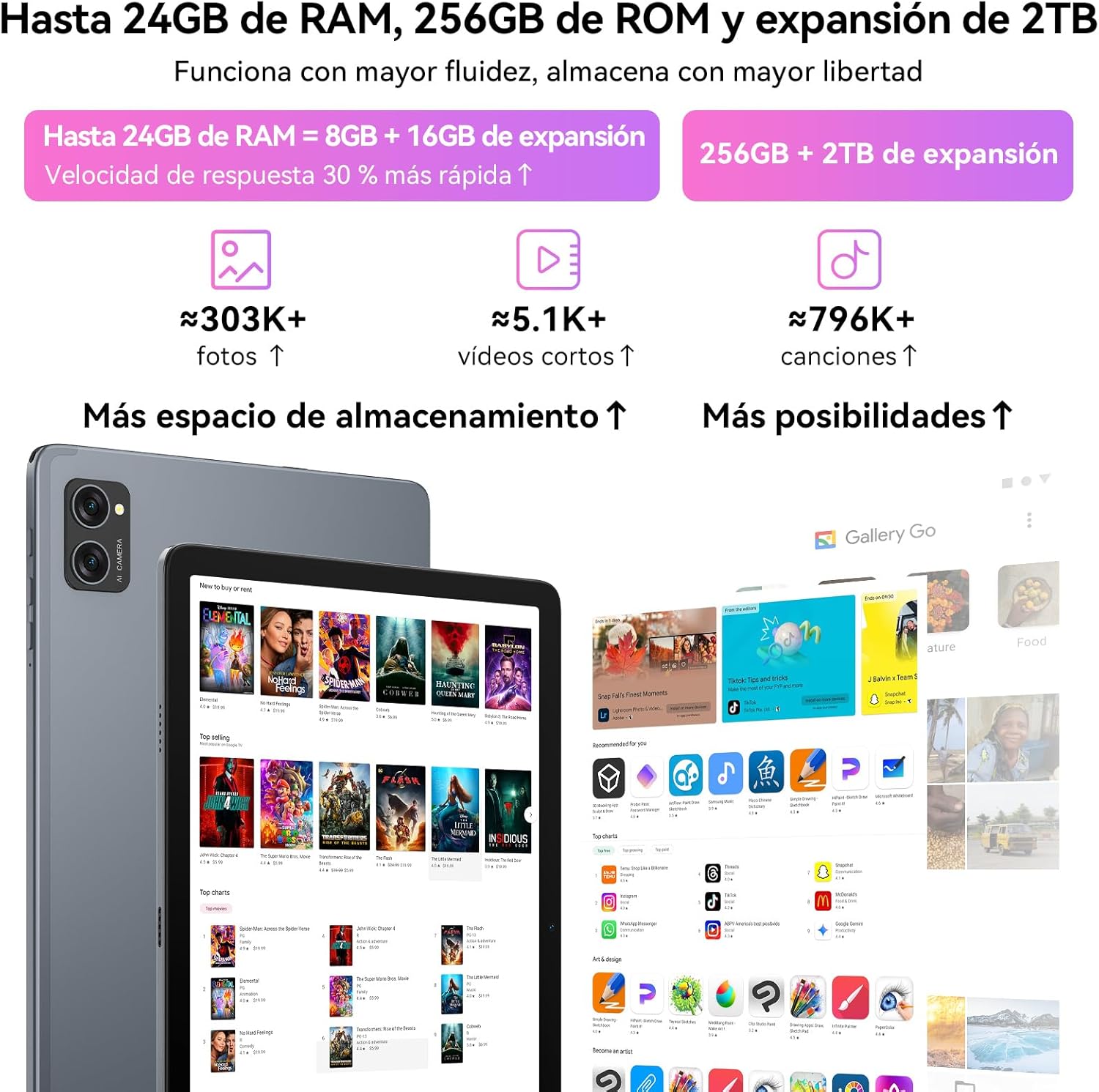 En cuanto a rendimiento, la Tabwee T20 combina 8 GB de memoria física con 16 GB virtuales, lo que permite ejecutar aplicaciones exigentes como Adobe, juegos de gran tamaño y más de 20 pestañas de navegador abiertas simultáneamente sin interrupciones. Su almacenamiento interno de 256 GB puede albergar más de 100.000 fotos o 500 vídeos en HD, y si necesitas más espacio, admite tarjetas MicroSD de hasta 2 TB. Con esta capacidad, el mensaje de “almacenamiento insuficiente” se convierte en cosa del pasado, incluso para quienes trabajan con archivos de diseño o producción audiovisual.Incorpora Android 16, que ofrece mejoras integrales en rendimiento, seguridad y fluidez. El panel de control de privacidad avanzado y la gestión optimizada de permisos protegen tus datos, mientras que el motor interactivo mejorado garantiza animaciones más suaves y un inicio de aplicaciones más rápido. A esto se suma la integración de la Google Gemini AI 2.0, que permite conversaciones inteligentes, reconocimiento de voz y traducción en tiempo real. La combinación de Android 16 y Gemini 2.0 convierte a esta tablet en un dispositivo que supera ampliamente a generaciones anteriores como Android 15 o 14, ofreciendo una experiencia más inteligente y personalizada.