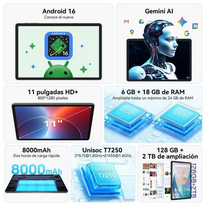 El procesador Unisoc T7250 de ocho núcleos, potenciado por la arquitectura Gemini AI, impulsa un rendimiento estable y eficiente. Pero el salto cualitativo llega con la integración de Google Gemini AI 2.0, que redefine la productividad móvil. Gracias a esta tecnología, la tablet es capaz de procesar comandos naturales, transcribir reuniones, resumir documentos extensos o generar imágenes y contenido mediante voz o texto. Para creadores, estudiantes, técnicos y profesionales digitales, esta capa de inteligencia artificial convierte la Tabwee T50 en un asistente de trabajo siempre disponible.