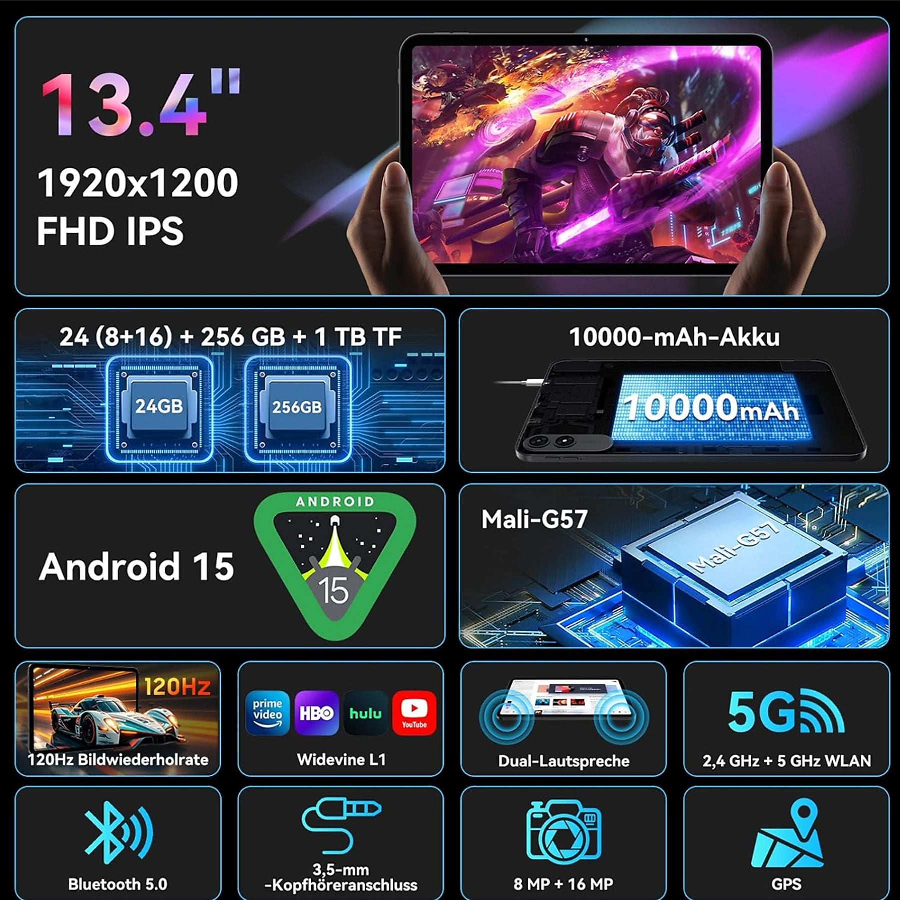 La Tabwee T60 Pro se presenta como un centro de mando móvil de 13.4 pulgadas que difumina la línea entre una tablet de alto rendimiento y un ordenador ultraportátil. Con el ecosistema de Android 15 como base, este dispositivo está diseñado para quienes exigen fluidez absoluta en su flujo de trabajo y una experiencia cinematográfica en su tiempo libre. La verdadera estrella de la Tabwee T60 Pro es su pantalla. No solo hablamos de un panel generoso de 13.4 pulgadas; hablamos de una tasa de refresco de 120Hz. Esta velocidad de actualización garantiza que cada gesto, cada desplazamiento por redes sociales y cada partida en videojuegos sea suave como la seda, eliminando cualquier rastro de lag visual.