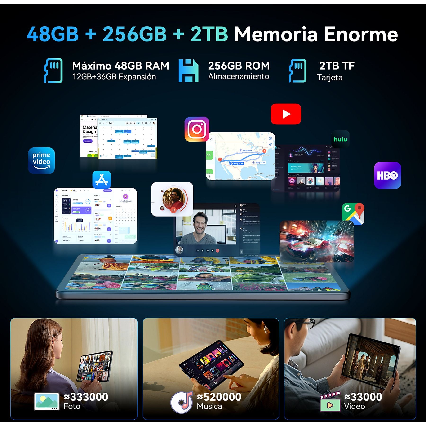 En su interior cuenta con el procesador Octa-Core Unisoc T7280 que gestiona la multitarea. Combina 12 GB de RAM física con 36 GB virtuales, alcanzando unos asombrosos 48 GB de RAM total. Esto, sumado a 256 GB de almacenamiento (expandibles hasta 2 TB), garantiza que nunca te quedes sin espacio ni velocidad, incluso con las aplicaciones más exigentes de Android 16. Hablando de software, la integración nativa de Gemini AI convierte a la T60 en una asistente inteligente capaz de redactar correos, resumir textos o generar ideas creativas en segundos. Es una tablet que aprende de ti y optimiza los recursos para que el sistema siempre se sienta «recién estrenado».