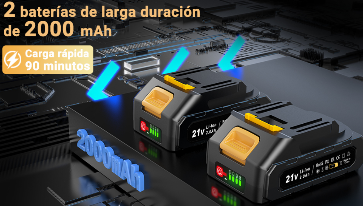 Además, su embrague de 20 posiciones te permite ajustar el torque con exactitud quirúrgica. Esto es vital para los principiantes: evita que hundas demasiado el tornillo o que dañes la superficie de trabajo, garantizando acabados profesionales desde el primer intento. Un apunte: Aunque este modelo es una bestia en madera y metal, es importante aclarar que no cuenta con modo de percusión. Si buscas perforar hormigón armado, necesitarás un hermano mayor; pero para el 95% de las tareas domésticas y de bricolaje, este atornillador es el rey absoluto de la versatilidad.Nada corta más la inspiración que quedarse a mitad de un proyecto porque la batería se ha agotado. El kit soluciona esto de raíz incluyendo dos baterías de iones de litio de 2,0 Ah. Mientras usas una, la otra puede estar en el cargador. Gracias a su tecnología de carga rápida, estará lista en solo 90 minutos. Además, los indicadores LED integrados en el cuerpo del taladro te permiten monitorizar el estado de la energía en tiempo real, para que nunca te pille desprevenido.