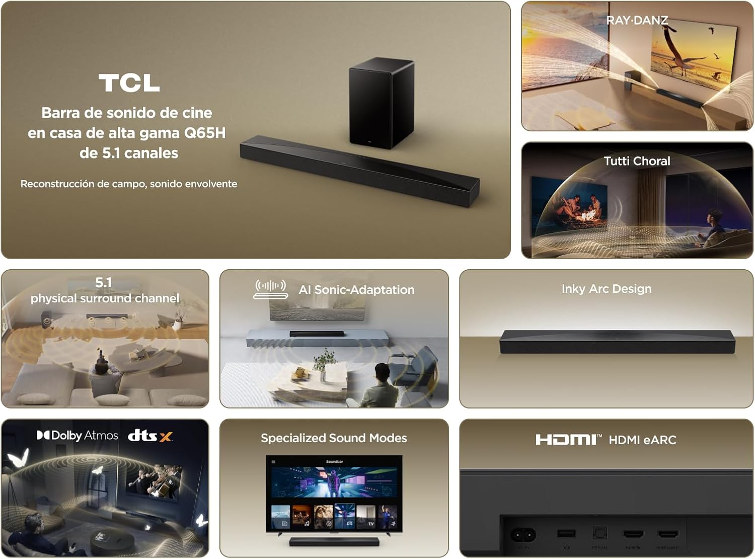 Diseñada para integrarse en salones modernos, este sistema de 5.1 canales utiliza tecnologías exclusivas para transformar cualquier salón en una sala de estreno. A diferencia de las barras convencionales que dependen en exceso del procesamiento digital para simular amplitud, la TCL Q65H incorpora la exclusiva tecnología acústica RAY·DANZ. Este sistema utiliza reflectores acústicos sintonizados con precisión y altavoces laterales para expandir el sonido de forma física y orgánica. El resultado es un escenario sonoro mucho más amplio y natural, que llena la habitación sin las distorsiones que a veces genera el software.