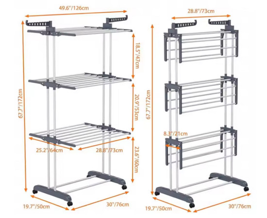 Además, la seguridad y la estabilidad son primordiales. Dos de las ruedas incluyen frenos de bloqueo eficientes. Una vez que has posicionado el tendedero en el lugar deseado, simplemente activa los frenos para asegurarlo completamente, evitando movimientos accidentales que podrían arruinar tu colada. Esta característica de fácil movilidad y ajuste lo convierte en un aliado práctico para cualquier hogar.