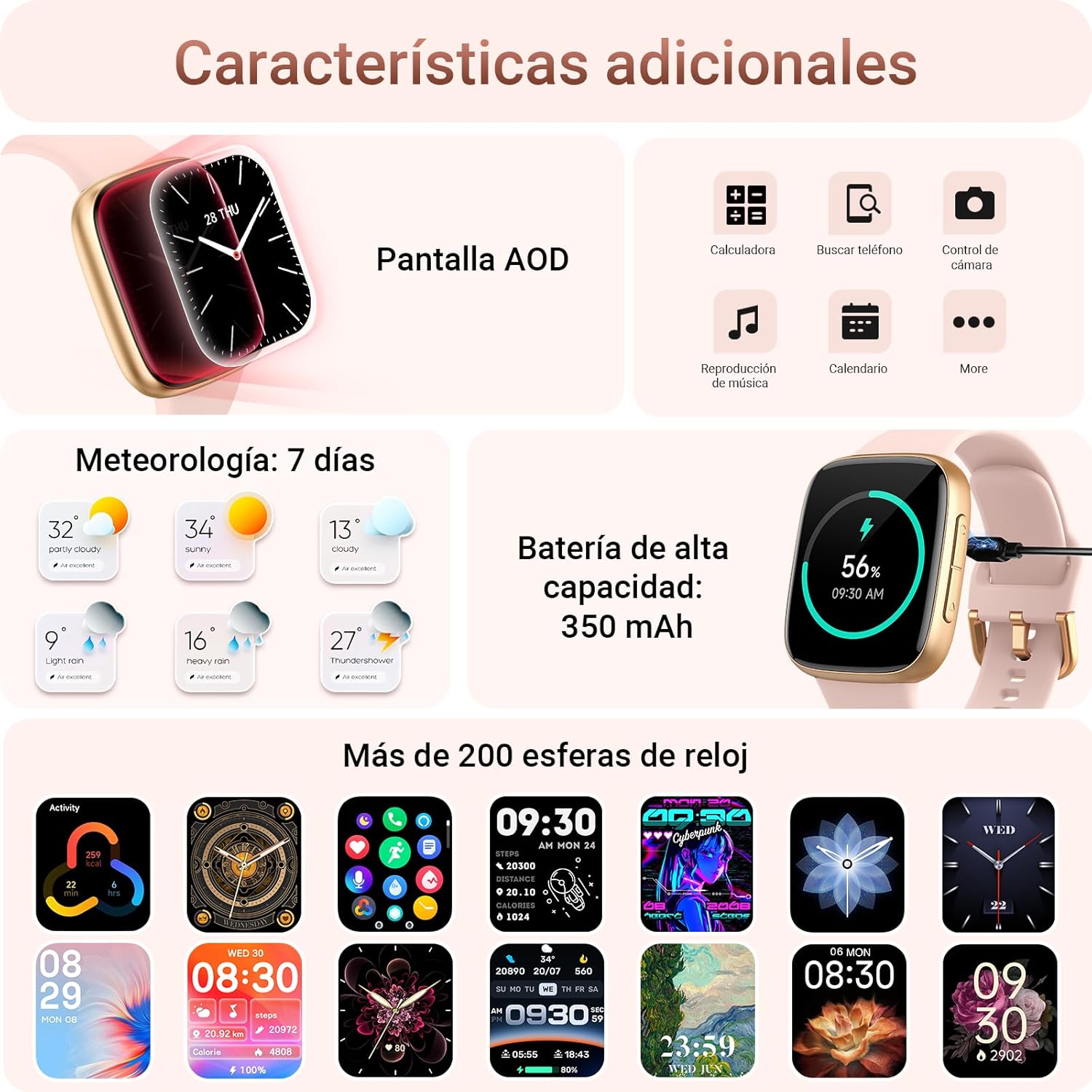 Este smartwatch combina diseño elegante con funciones que lo convierten en un compañero indispensable para el día a día, tanto en el trabajo como en el deporte o el cuidado personal. Uno de sus mayores atractivos es su pantalla Amoled de 1,85 pulgadas, que ofrece una frecuencia de actualización de 40 FPS y gráficos ultra fluidos en 24 bits de color. Esta tecnología proporciona una experiencia visual brillante y nítida, duplicando la velocidad de respuesta respecto a relojes inteligentes tradicionales y consumiendo un 50 % menos de energía. Además, incorpora la exclusiva función Always On Display (AOD), que permite encender y apagar la pantalla mediante gestos, aportando comodidad y practicidad en cualquier situación.