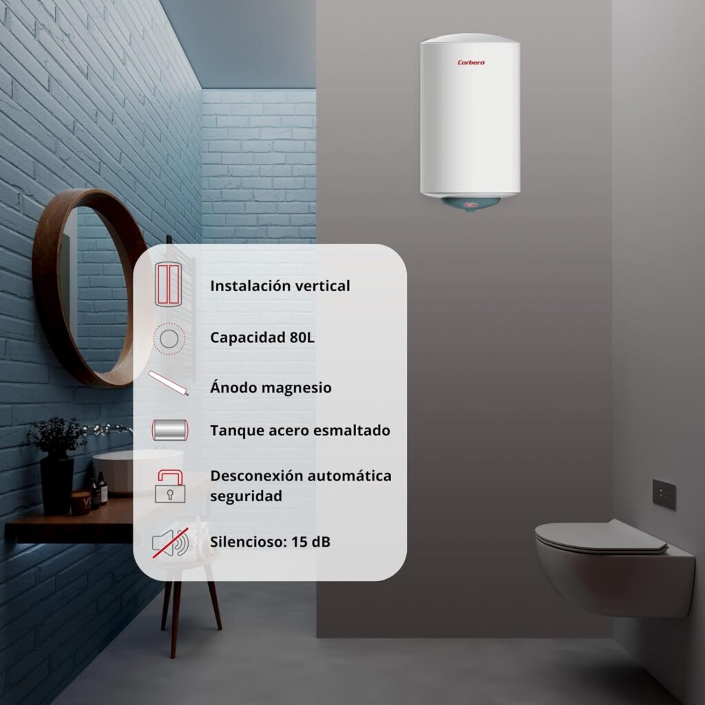 El termo eléctrico Corberó de 80 litros garantiza el agua caliente constante en hogares de tamaño medio. Su capacidad está pensada para cubrir sin esfuerzo las necesidades diarias de familias de 3 a 4 personas, ofreciendo un suministro generoso tanto para duchas consecutivas como para tareas domésticas como lavar platos o limpiar, sin interrupciones ni esperas prolongadas. Esta amplitud lo convierte en un aliado fiable en viviendas donde el confort y la disponibilidad inmediata de agua caliente son esenciales.Su diseño vertical, una característica que facilita enormemente la instalación en la pared sin ocupar espacio útil. En hogares donde cada metro cuenta, disponer de un termo que se integra de forma discreta y funcional es una ventaja significativa. Su estructura está pensada para optimizar el rendimiento sin sacrificar capacidad, permitiendo que el aparato se adapte a baños, cocinas o cuartos de servicio con total comodidad.