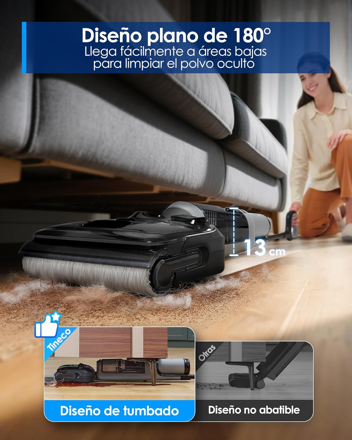 La Tineco Floor One i5 Stretch no solo combina la aspiración en seco y húmedo en un solo paso, sino que rompe las barreras físicas de las aspiradoras convencionales gracias a su revolucionaria ingeniería de reposo plano completo.El mayor desafío al limpiar con dispositivos inalámbricos suele ser el acceso bajo el mobiliario. La Tineco i5 Stretch soluciona este problema reclinándose sin esfuerzo hasta una posición plana de 180°. Con una altura de apenas 13 cm cuando está totalmente horizontal, este dispositivo permite eliminar el polvo y la suciedad oculta debajo de camas, sofás y armarios con una flexibilidad sin precedentes. A diferencia de otros modelos, su sistema está diseñado para mantener el rendimiento de succión y la gestión de líquidos incluso en esta posición extrema.