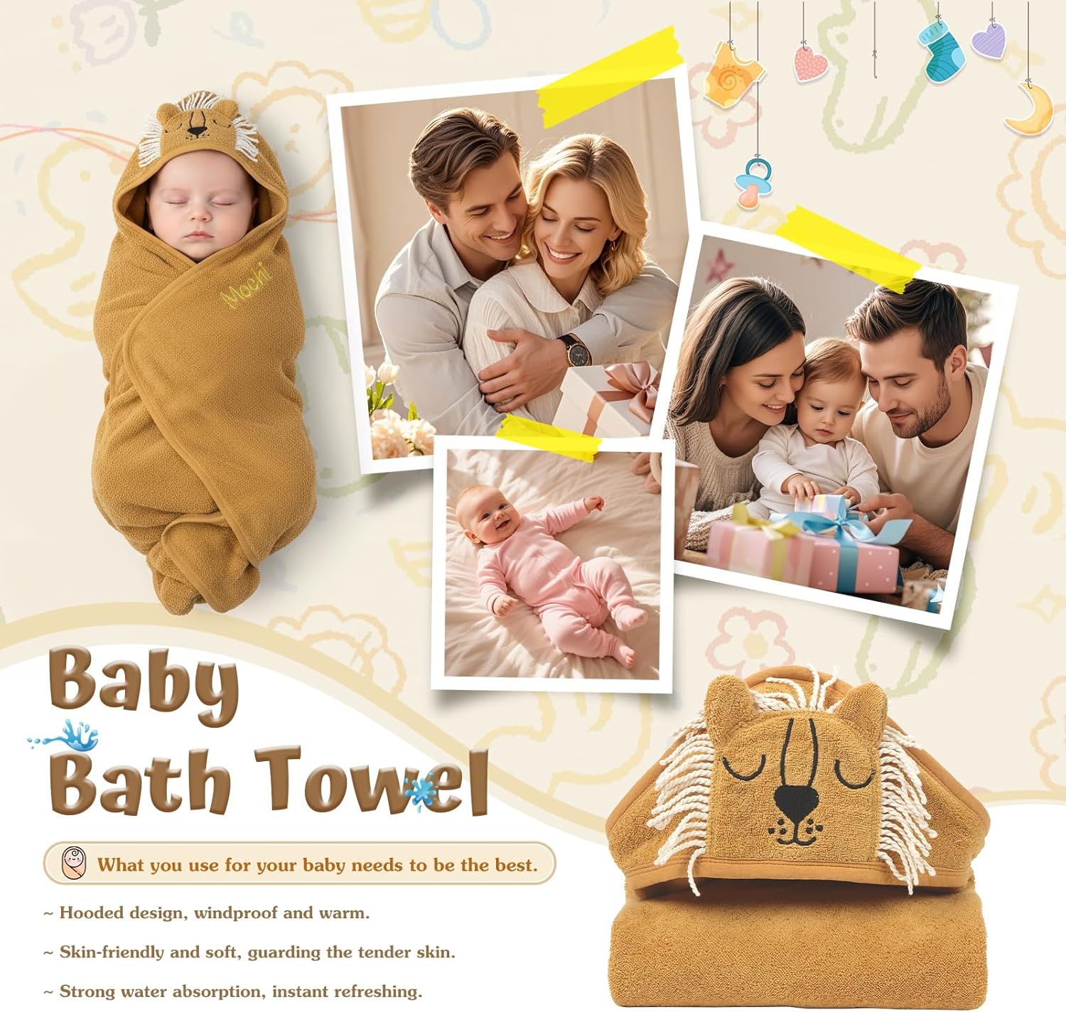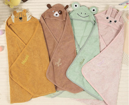 Uno de los aspectos más encantadores de esta toalla personalizada con capucha para bebé son sus divertidos diseños de animales. Puedes elegir entre león, conejo, rana o cachorro, cada uno con un estilo tierno que fascina a los más pequeños y convierte el momento del baño en una experiencia divertida. La capucha no solo protege la cabeza del frío, sino que también añade un toque entrañable perfecto para capturar fotos inolvidables. Sus bordes redondeados y costuras reforzadas aseguran una gran durabilidad, resistiendo lavados frecuentes sin perder suavidad ni color.Lo que realmente distingue a esta toalla es la posibilidad de personalizarla con el nombre del bebé. Puedes elegir entre diferentes fuentes y colores de hilo para bordar, adaptando el diseño a tus preferencias y creando un accesorio exclusivo. Esta personalización convierte la toalla en un objeto especial, pensado no solo para el uso diario, sino también como recuerdo del crecimiento del niño. Además, es lavable a máquina, lo que facilita su mantenimiento y asegura que se mantenga impecable con el paso del tiempo.