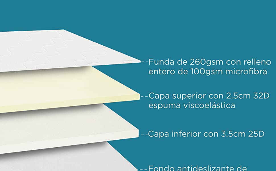 Por ejemplo, aquí tenemos uno de la casa Bedsure fabricado en espuma viscoelástica hipoalergénica y transpirable. Con sus seis centímetros de grosor, se adapta a nuestra fisonomía de forma que la amortiguación sea optima. En definitiva, alarga la vida de tu colchón, corrige las anomalías del que tengas y es muy cómodo.
