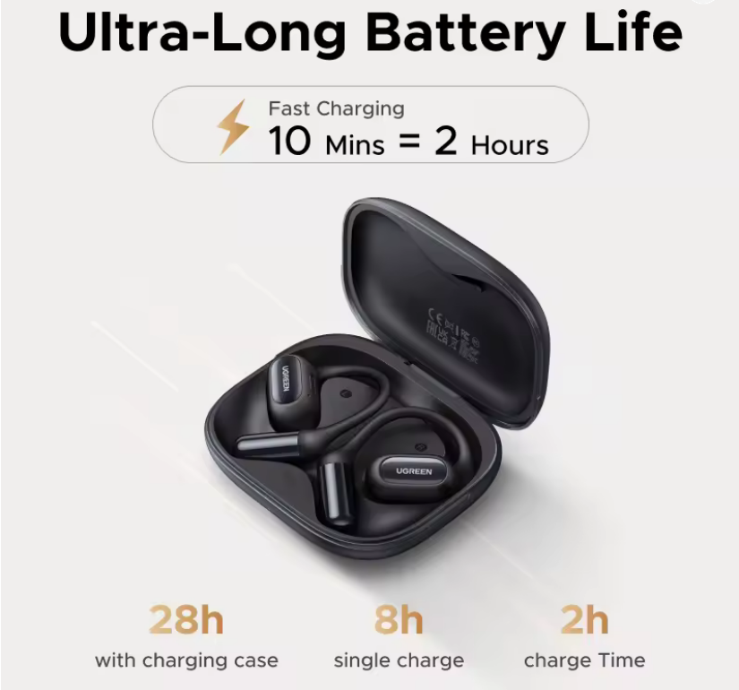 Uno de los puntos más destacados de los Ugreen FitBuds es su autonomía total de hasta 28 horas. Cada carga ofrece alrededor de 8 horas de uso continuo, y el estuche portátil añade recargas adicionales que extienden la duración sin necesidad de buscar un enchufe. Con un puerto de carga USB-C, el proceso es rápido y universal, permitiendo que en apenas 1,5 horas los auriculares estén listos y en 2 horas el estuche recupere toda su energía.A diferencia de los auriculares intrauditivos tradicionales, los FitBuds no generan presión interna, lo que se traduce en una experiencia más natural y menos fatigante. Su diseño elegante y ligero los convierte en un accesorio discreto pero potente, pensado para quienes valoran tanto la estética como la funcionalidad.