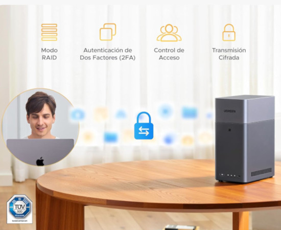 La configuración del NASync DH2300 es rápida y accesible: en segundos tendrás el dispositivo en tu red y listo para compartir archivos con Windows, macOS, Android, iOS, navegadores web y Smart TVs. La salida HDMI y la compatibilidad DLNA permiten reproducir contenido en 4K Ultra HD directamente en el televisor, mientras que la app móvil y la app TV facilitan el acceso remoto y la experiencia multimedia en familia. La app del NASync incluye un módulo NFC integrado para conexión con un solo toque, eliminando configuraciones engorrosas y manteniendo la usabilidad al nivel de un servicio en la nube. La experiencia es fluida: autentícate y accede a tus archivos desde cualquier dispositivo sin perder seguridad.La función de Álbum de fotos impulsada por IA organiza automáticamente tus imágenes por rostros, escenas y lugares, detecta y elimina duplicados y crea álbumes personalizados—por ejemplo, para seguir el crecimiento de los niños. Compartir recuerdos es sencillo mediante códigos QR o enlaces, manteniendo el control sobre quién puede ver cada carpeta.Con el NASync DH2300, tus datos permanecen en tus manos. El sistema incorpora cifrado avanzado, firewall y autenticación de dos factores para proteger archivos contra accesos no autorizados. UGREEN no tiene acceso a tus datos privados, lo que garantiza confidencialidad total frente a soluciones en la nube.