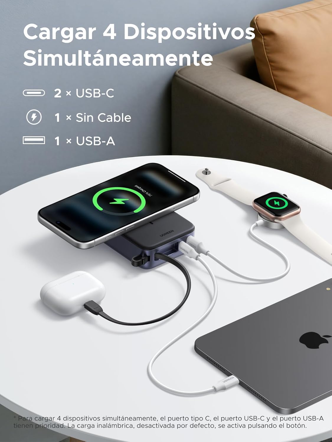 La verdadera revolución de esta batería reside en su certificación Qi2. Este estándar de última generación optimiza la alineación magnética (estilo MagSafe) para ofrecer una carga rápida inalámbrica de hasta 15W. Puedes cargar un iPhone 17 Pro al 38% en solo 30 minutos sin necesidad de cables. La sujeción magnética es firme y precisa, garantizando que la transferencia de energía sea eficiente y minimizando la pérdida de calor habitual en cargadores inalámbricos de menor calidad. Uno de los mayores desafíos al viajar es llevar múltiples cargadores. La Ugreen Zapix Qi2 simplifica tu mochila al permitir la carga de hasta 4 dispositivos simultáneamente. Gracias a su gestión inteligente de la energía, puedes alimentar: