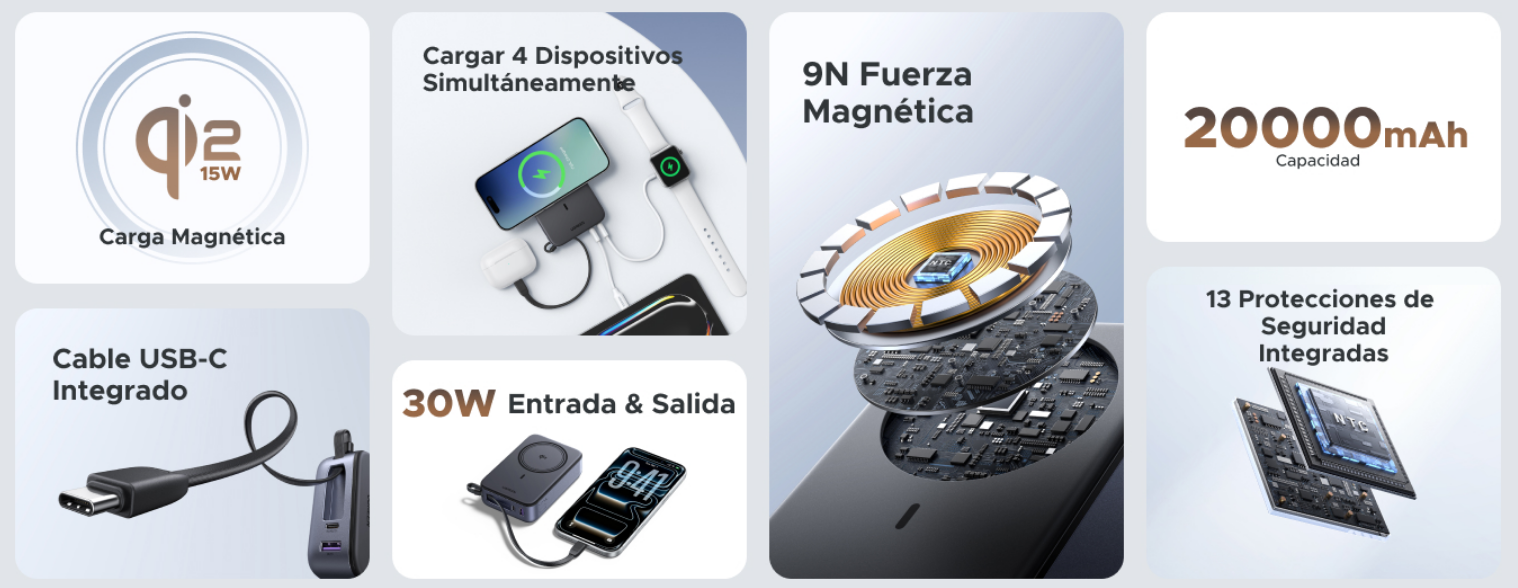 Es la solución «todo en uno» perfecta para entornos de teletrabajo donde necesitas mantener tu ecosistema tecnológico siempre a punto. La eficiencia no solo se aplica a la descarga. Esta batería cuenta con carga rápida bidireccional de 30W a través de su puerto USB-C. Esto permite dos cosas: cargar tus dispositivos a alta velocidad por cable y, lo más importante, recargar la propia batería de 20.000 mAh en un tiempo récord. Un detalle de diseño brillante es su cable USB-C integrado de alta resistencia, que no solo elimina la necesidad de llevar cables sueltos, sino que también funciona como un práctico cordón de transporte, facilitando su sujeción en cualquier situación. La potencia sin control puede dañar tus dispositivos. Por ello, Ugreen ha implementado un sistema de doble protección de seguridad: